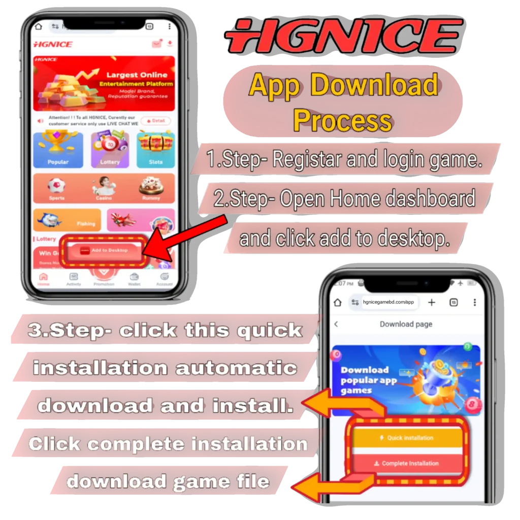 Hgnice Login Game হোম ড্যাশবোর্ডে প্রবেশ করার পর, “Add to Desktop” বাটনে ক্লিক করার পর একটি ডাউনলোড পেজ খুলবে, যেখানে “Quick Installation” বাটনে ক্লিক করলে অটোমেটিকভাবে ডাউনলোড এবং install প্রক্রিয়া শুরু হবে। নিচে থাকা “Complete Installation” বাটনে ক্লিক করে পুরো গেম Apk ফাইলটি Download হবে।