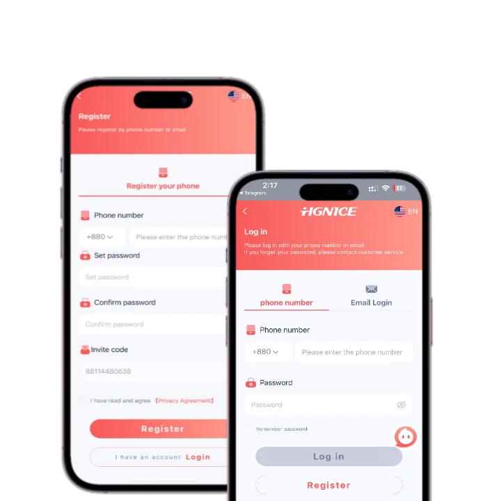 - Register বাটনে ক্লিক করুন এবং মোবাইল নাম্বার লিখুন। নাম্বারের শুরুতে (0) ব্যবহার করবেন না। এরপর একটি নিরাপদ পাসওয়ার্ড সেট করুন এবং তা কনফার্ম করুন। একাউন্ট তৈরি হওয়ার সময় Invitation Code স্বয়ংক্রিয়ভাবে যুক্ত হবে। Privacy Agreement-এ টিক নিশ্চিত করুন। Register বাটনে ক্লিক করলে আপনার একাউন্ট কার্যকর হবে।